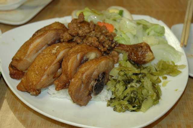 For the pittance they charge, something like US$5.75 (oh yeah cash only place), you get a humongous portion of chicken leg rice 雞腿飯. No wonder this place is so busy....it appeals to the El Cheapsadores in us! Pickled mustard greens (suan tsai 酸菜)are awesome, probably the best in town (even better than Formosa Bento House in Redwood City). Even the chicken tasted good.